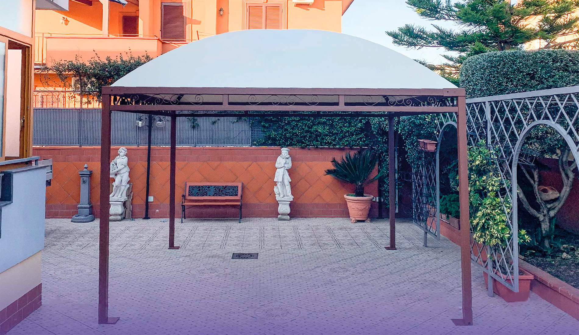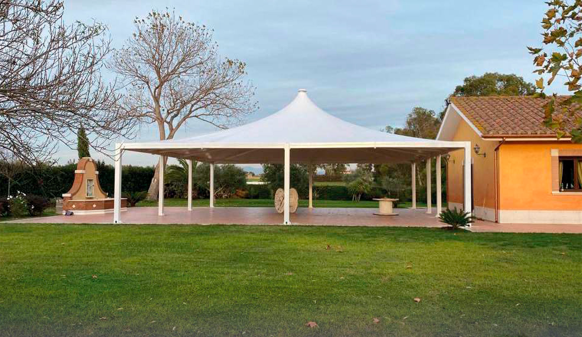 Gazebi con struttura in acciaio zincato a caldo e verniciato a polveri epossidiche. Rivestimento con teli in PVC ignifugo cl 2 realizzabili su misura. Possono essere utilizzati all’interno di aree urbane pubbliche e private.